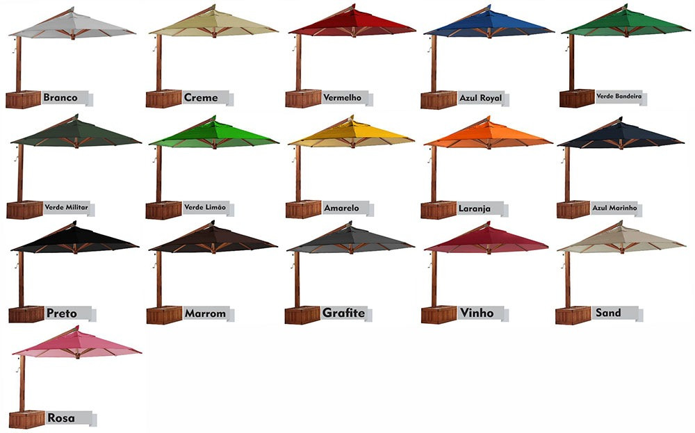 - Este modelo de ombrelone é composto por 1 floreira ou 1 base de concreto revestida em fibra ou madeira, 1 esteio, 1 braço de armação e 1 armação, fabricados em madeira inteiriça, interligados entre si por um conjunto reforçado de ferragens padronizadas na cor preta.