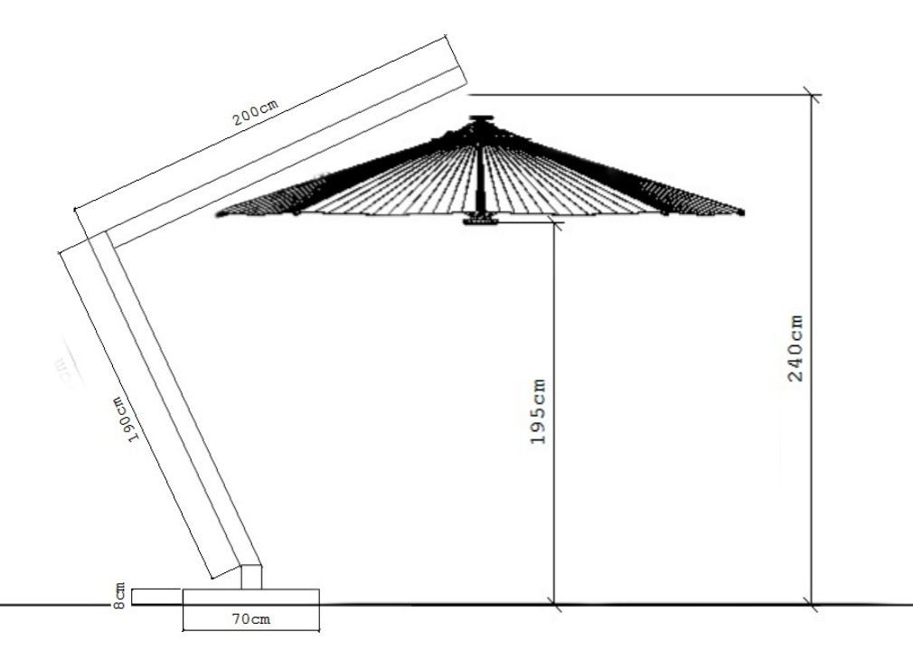- Este modelo de ombrelone é composto por 1 floreira ou 1 base de concreto revestida em fibra ou madeira, 1 esteio, 1 braço de armação e 1 armação, fabricados em madeira inteiriça, interligados entre si por um conjunto reforçado de ferragens padronizadas na cor preta.