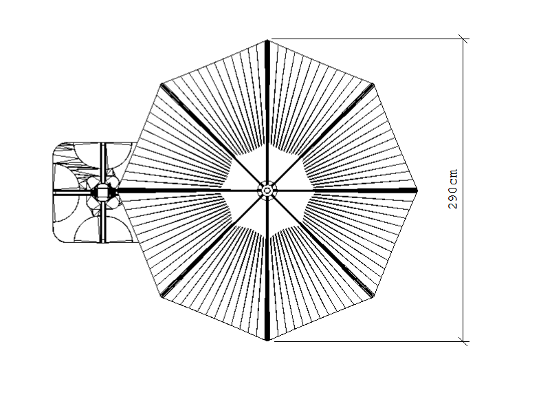 - Este modelo de ombrelone é composto por 1 floreira ou 1 base de concreto revestida em fibra ou madeira, 1 esteio, 1 braço de armação e 1 armação, fabricados em madeira inteiriça, interligados entre si por um conjunto reforçado de ferragens padronizadas na cor preta.